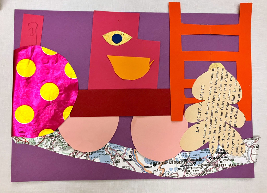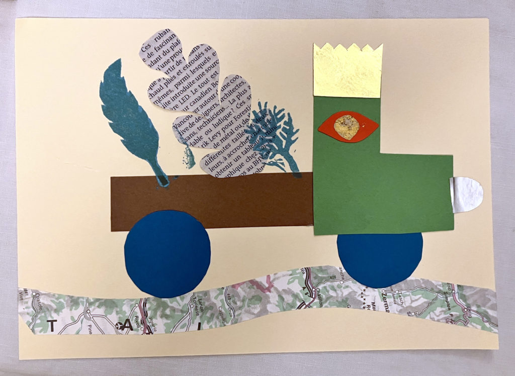Je mets à disposition des formes que j’ai découpées à la main, des papiers à découper, ainsi que des tampons que j’ai créés pour l’occasion. J’explique comment construire un camion et présente les différents éléments à piocher, sans modèle à recopier précisément. Les enfants composent ensuite leur paysage-personnage. Je n’interviens que pour un besoin de découpe spécifique, ou pour proposer des éléments en papier doré (toujours très recherché!). Et donc, ça récolte, ça colle, ça tamponne, ça découpe…c’est vivant et créatif et ça fait du bien 🙂