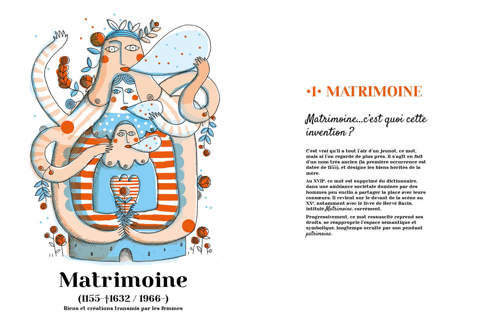 Projet né d’une commande de ma Ville pour ‘animer’ un colloque intitulé « Matrimoine & Territoires ». Le concept de matrimoine ne m’étant pas familier, j’ai fait des recherches qui m’ont permis d’apprivoiser ce mot et bien d’autres. C’est ce cheminement que j’ai souhaité partager : la découverte d’histoires complexes, de racines profondes ou fragiles. Des connaissances pour porter un nouveau regard sur des mots méconnus ou mal aimés.